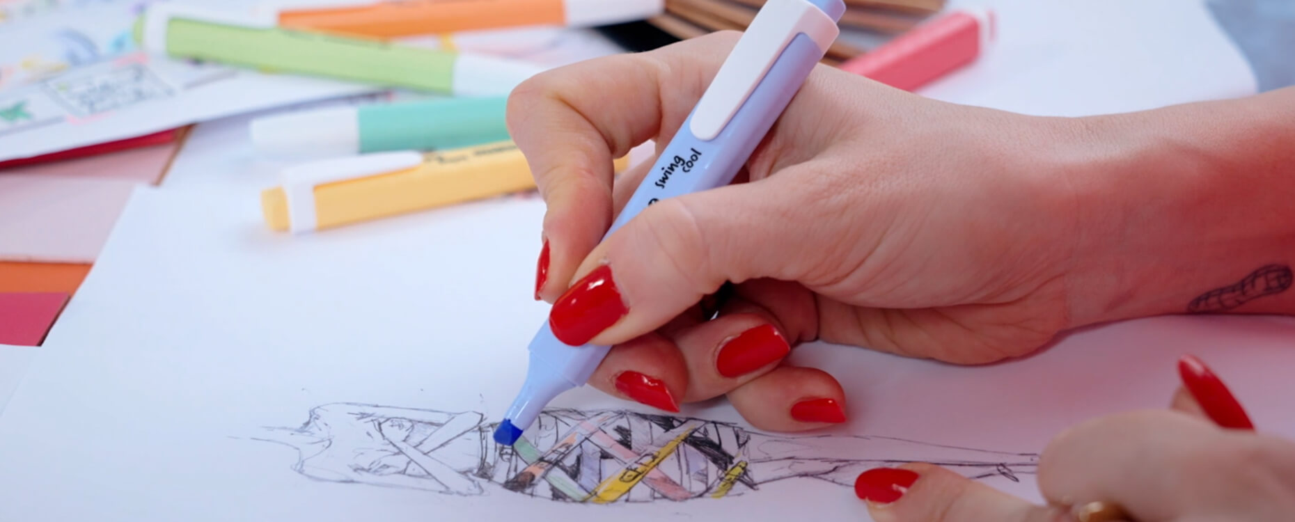 Marina Hoermanseder usou todas as oito cores fluorescentes e as dez cores em tom pastel, provando que swing cool é mais do que um marcador de texto. A designer também usa essas maravilhosas para colorir seus trabalhos de design. Hoermanseder, que é conhecida por suas fivelas especiais e coleções coloridas, traz seu mundo fashion em harmonia com o mundo STABILO para desenvolver o deskset STABILO Swing Cool Fashion Edition.