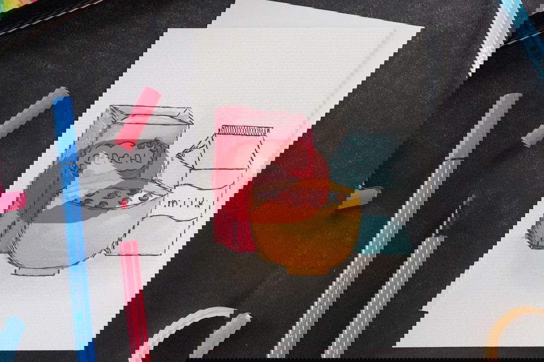 Schritt 3: Jetzt kommen die Farben ins Spiel. Hier kannst du dich frei entscheiden, welche dir am besten gefallen. Einzig bei der Milch solltest du bei weiß bleiben. Die Pen 68 Filzstifte sind optimal dafür geeignet.