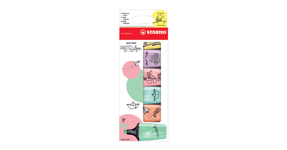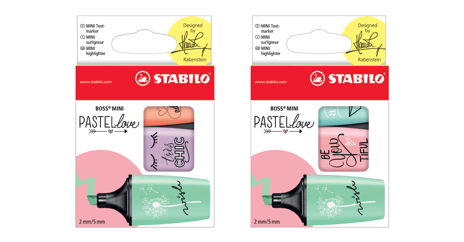 Duas opções de conjunto com três cores de BOSS Mini Pastellove cada: 113, 116, 129, ou: 116, 126, 155.