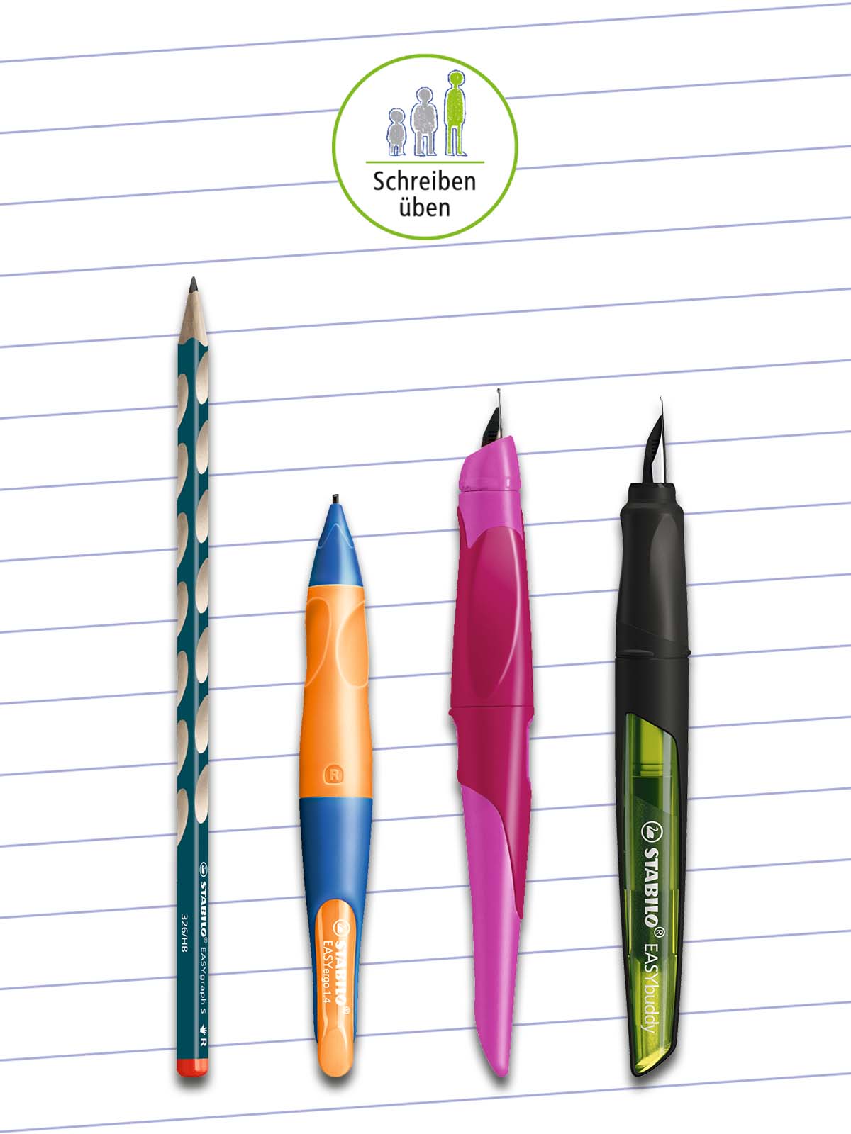Hat das Kind die ersten Phasen gemeistert, heißt es "Schreiben üben", um eine individuelle und effiziente Handschrift auszubilden. Hierfür eignen sich besonders die Füller STABILO EASYbuddy und STABILO EASYbirdy sowie der dünne Bleistift STABILO EASYgraph S und der Druckbleistift STABILO EASYergo 1.4 perfekt.