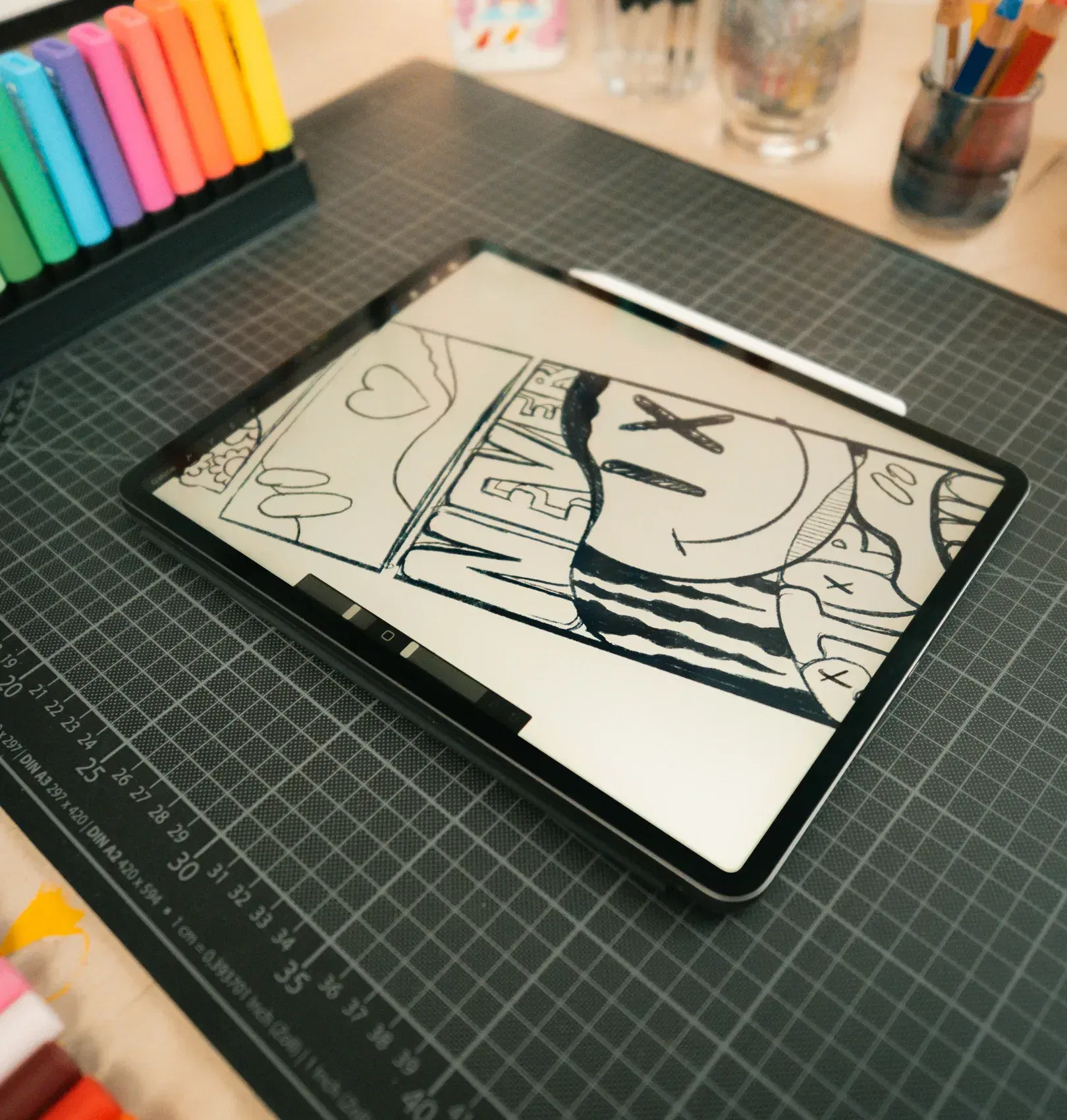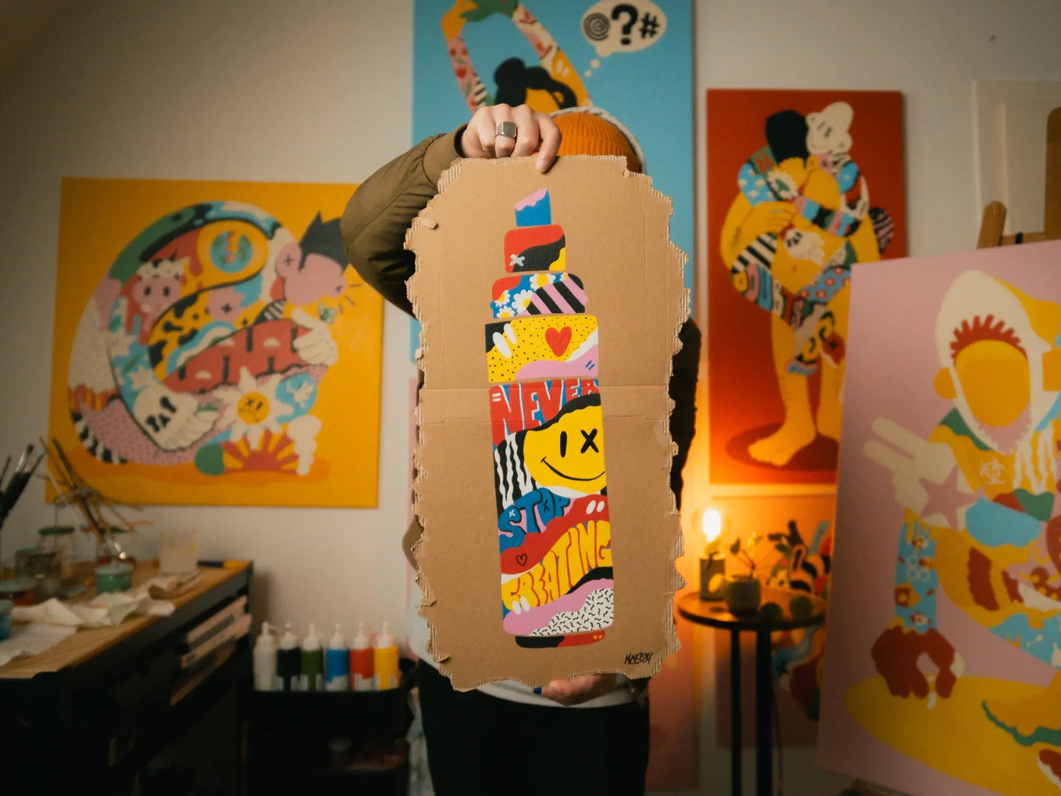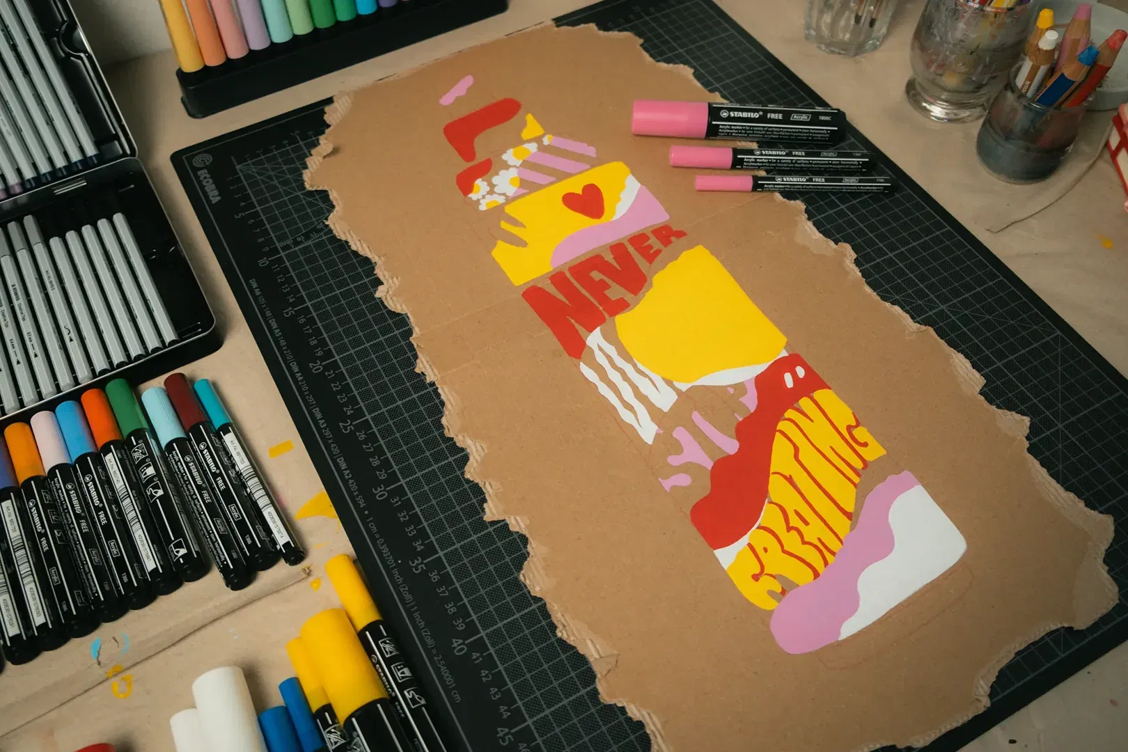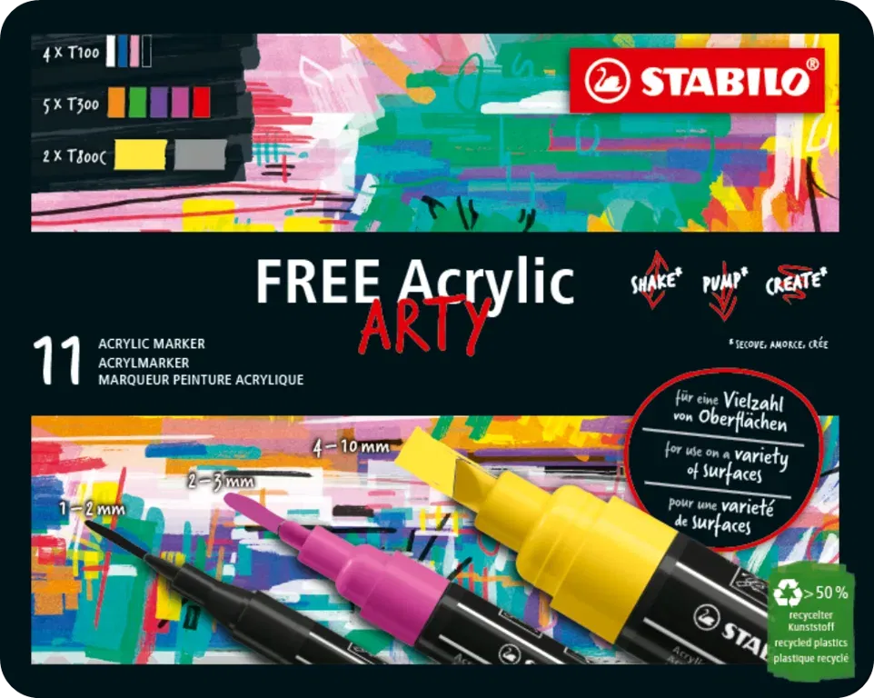 It‘s finally time to paint. The last and most fun step. I always start with the lightes color and work my way to the darkest. In this case, it would be white, yellow, pink, red, blue and finally black. For small details and contours, I use the thinnest nib (STABILO FREE Acrylic T100). Larger areas are easier to color with the medium (STABILO FREE Acrylic T300) or large (STABILO FREE Acrylic T800C) nib. On some materials it might be necessary to apply two or more layers of paint. Finally, add some details and we‘re done!
