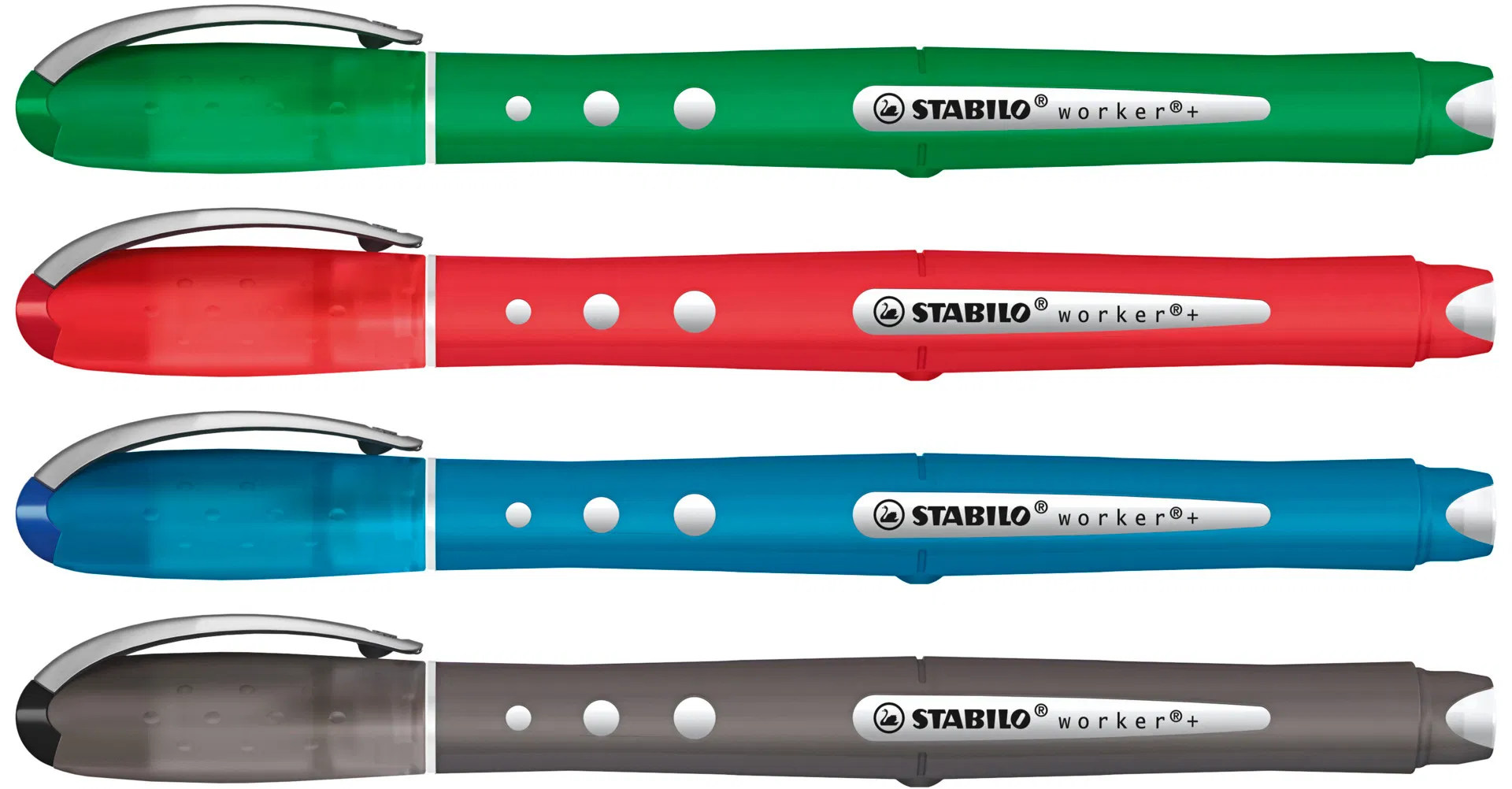 In order to meet the very high demands of those who write a lot, a pen must have special properties in terms of quality, technology and design - a matter of course for the STABILO worker+ colorful. The advanced free-ink technology of the rollerball ensures a smooth writing experience. High writing speed and clear typeface are a matter of course thanks to the fast rollerball. Its indestructible tip glides rapidly over the paper when writing. The ergonomic design enables the pen to be held in the best possible way and thus ensures long, fatigue-free writing. The complete rollerball pen is equipped with a non-slip and velvety soft surface. The practical roll stop on the shaft prevents you from rolling off the table when things get hectic. Its colorful look is a welcome exception in the uniformly silver-grey rollerball market.