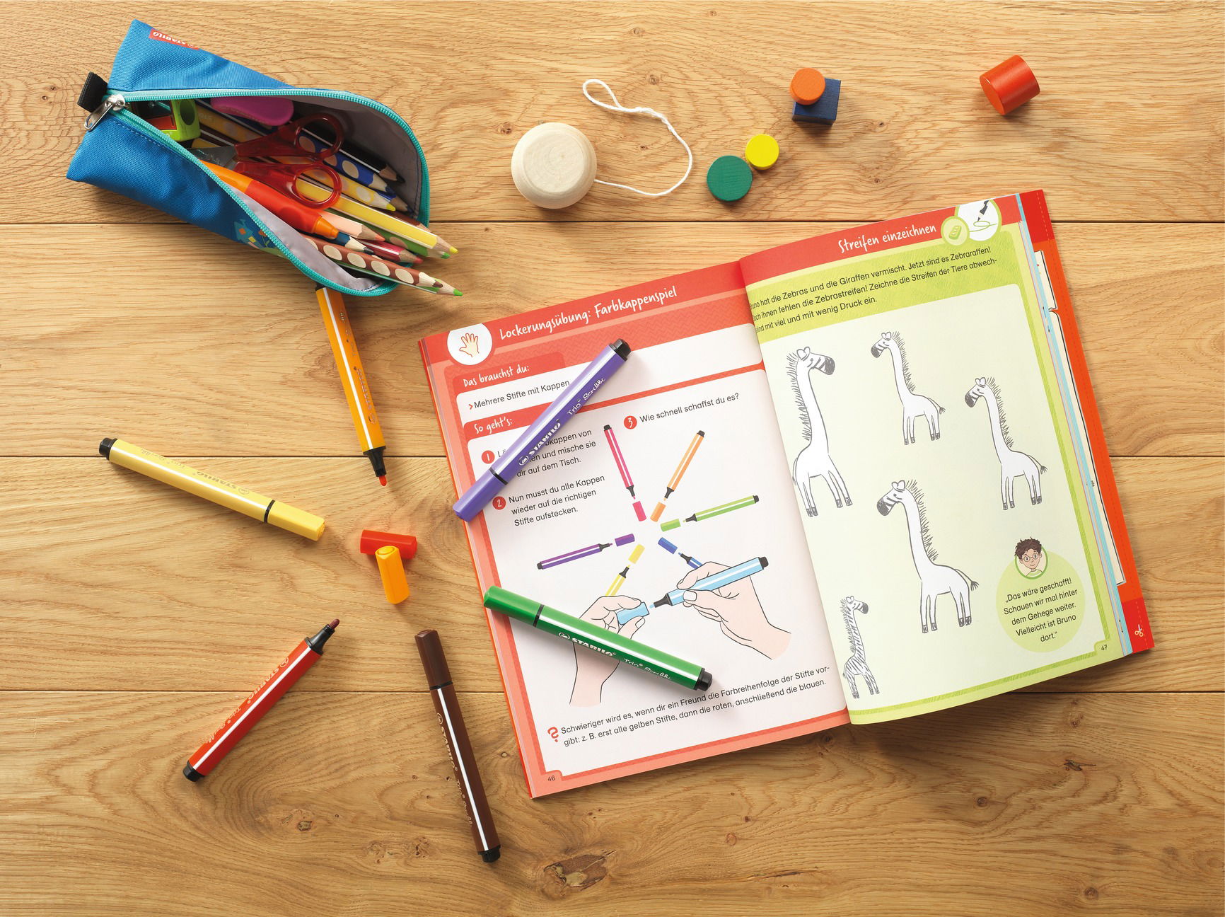 Hierfür gibt es zum Beispiel ganz spielerische Übungen für Vorschulkinder in der Heftreihe „Fit fürs Schreibenlernen“ von STABILO Education. Die spannenden Abenteuergeschichten rund um die 4 Entdecker-Freunde schaffen es, auch etwas weniger motivierte Kinder für das Bearbeiten der Übungen zu begeistern.