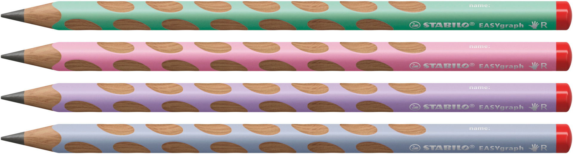 Als Teil der bewährten Produktlinie STABILO EASY Start ist der ergonomische Dreikant-Bleistift STABILO EASYgraph ein weiterer Baustein für das ergonomische Schreiben und auch in 4 Pastellfarben erhältlich. Mit den Farben Pastelllila, Pastellgrün, Pastellpink und Pastellblau kommen trendige Farben des beliebten Schreiblernstiftes auf den Markt. Am Stiftende zeigt dir der gelbe oder rote Farbcode, ob dein STABILO EASYgraph für Rechts- oder Linkshänder:innen gedacht ist. Beschrifte das Namensschild, damit dein STABILO EASYgraph nicht verloren geht.
