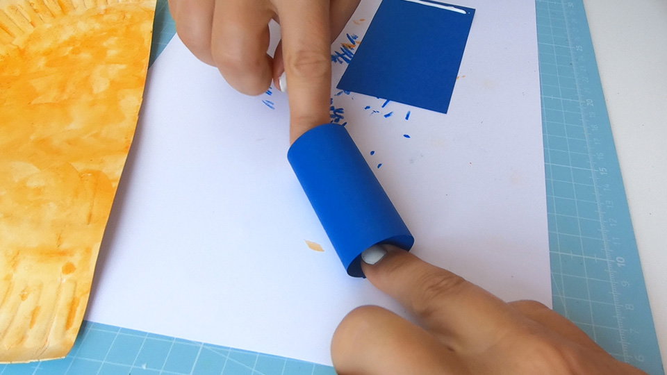 Forme aus dem Buntpapier zwei kleine Rollen und verklebe sie an den Enden.