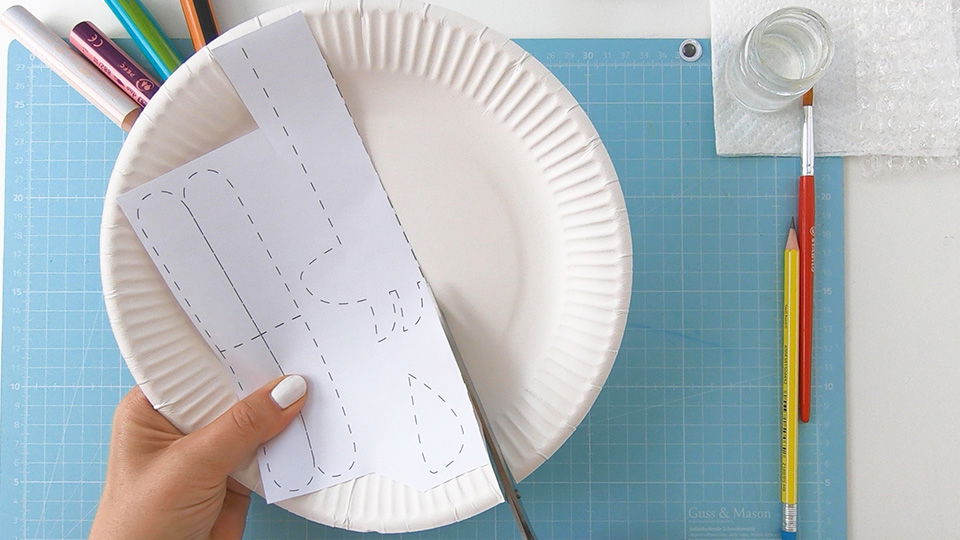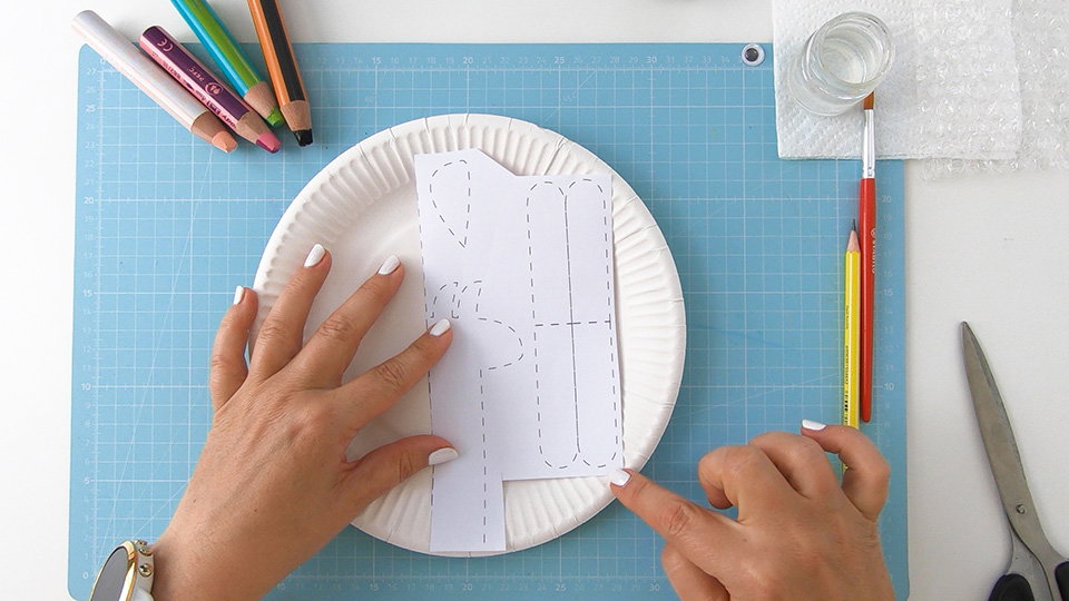 Drucke die Vorlage aus und schneide sie grob zu. Positioniere sie anschließend so auf dem Pappteller, dass alle Körperteile gut darauf Platz haben.
