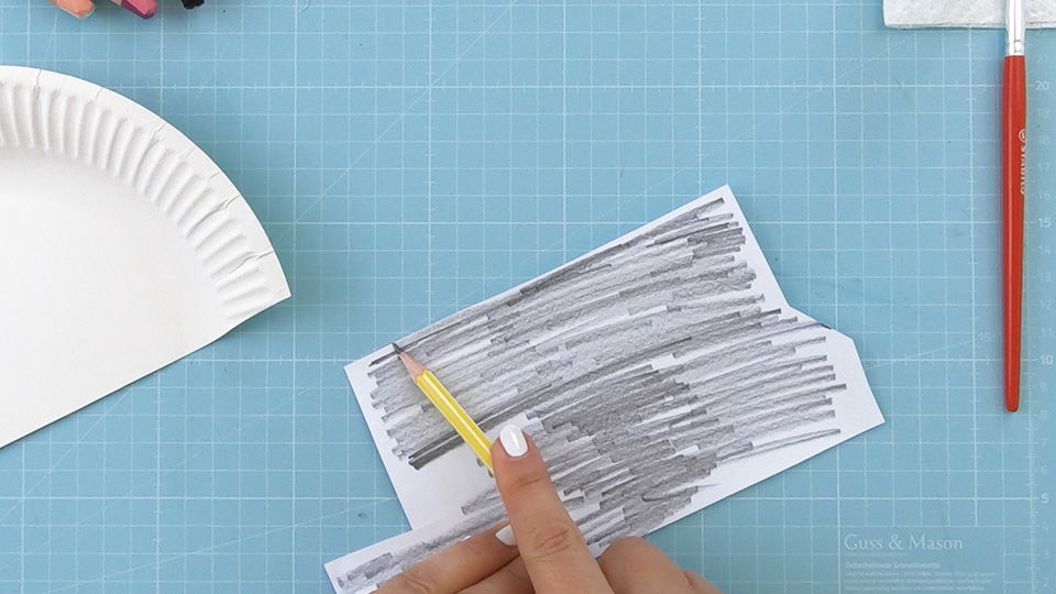 Übertrage die restlichen Körperteile mittels Transfertechnik auf den Pappteller, damit Du sie anschließend gut ausschneiden kannst. Nimm dazu einen Bleistift und male damit die komplette Rückseite Deiner Druckvorlage vollflächig an.