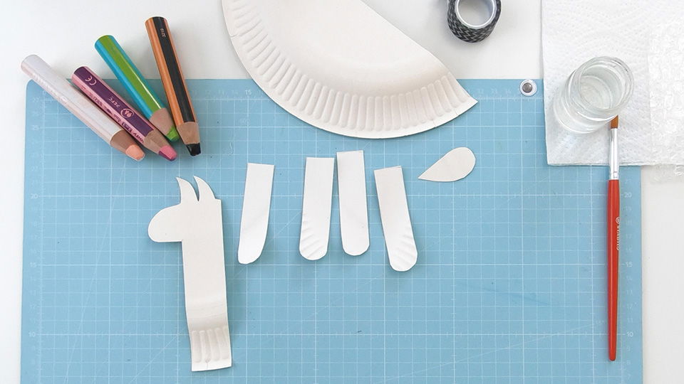 Schneide den Pappteller anschließend entlang der langen Druckvorlagen-Kante ab. Der abgeschnittene kleinere Teil des Papptellers ist der Körper des Lamas. Den kannst Du inzwischen zur Seite legen. Tipp: Klebe die Vorlage ggf. mit Washi Tape fest, damit sie nicht verutscht.