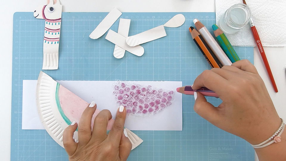 Für einen schönen zusätzlichen Effekt kannst Du auf den Körper des Lamas noch einen Noppenfolien-Druck anbringen. Schneide dazu die Folie in entsprechende Form (z. B. halbrund). Tauche die woody duo Spitze kurz ins Wasser ein und male die Noppen damit an. Drehe die Folie um und drücke sie auf die gewünschte Stelle des Papptellers.