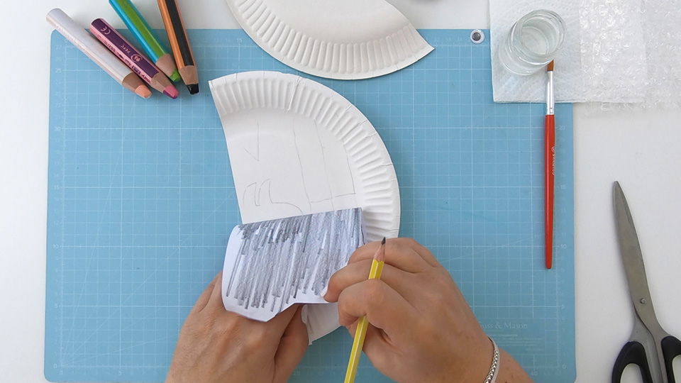 Wende das Blatt Papier und positioniere es wieder auf dem zugeschnittenen Pappteller. Halte es dort gut fest (es sollte nicht verrutschen) und zeichne alle Linien mit starkem Bleistift-Druck nach. Dadurch übertragen sich die Linienvorlagen auf den Pappteller, die Du dann anschließend mühelos ausschneiden kannst.