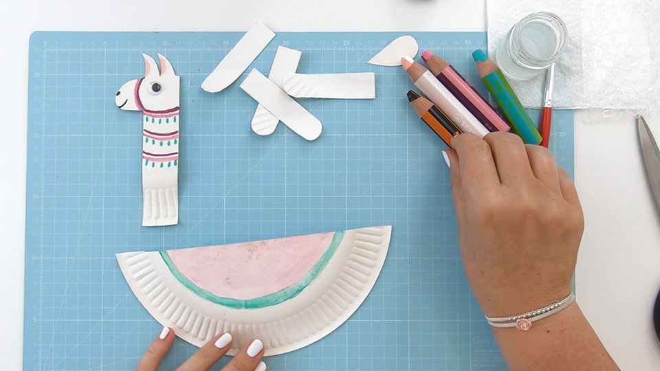 Jetzt wird es Zeit, Deinem Lama etwas Farbe zu verpassen. Male dazu ganz nach Belieben den Körper und den Hals/Kopf mit den woody duo Spitzen an und vermale ggf. größere Flächen mit Pinsel und Wasser. Tipp: Male auf der Rückseite des Papptellers, weil dort die Farbe besser hält.