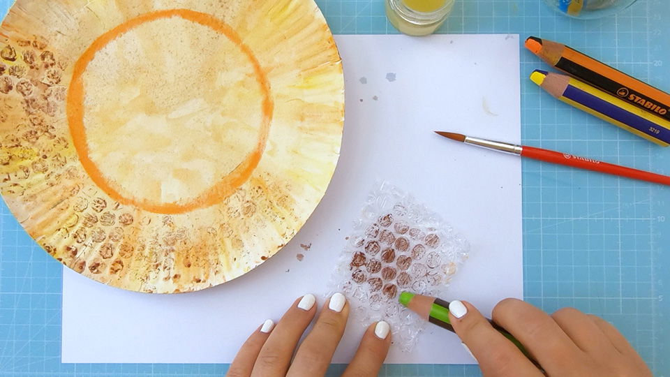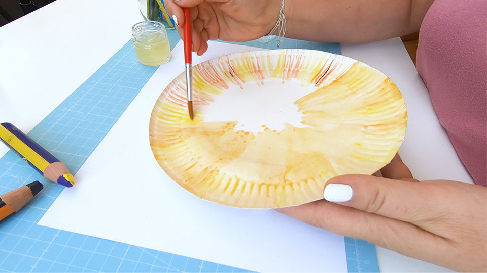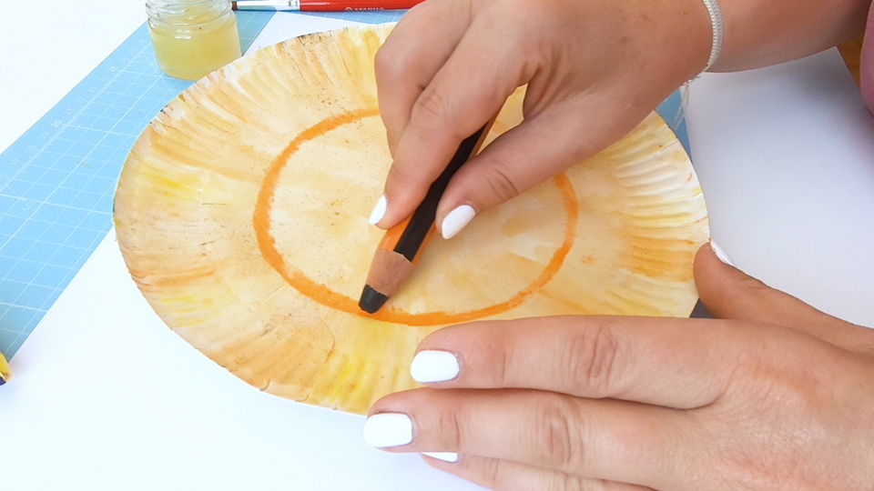 Zeichne auf der Rückseite des Papptellers (raue Seite) entlang der Rillen abwechselnd gelbe und orange Streifen. Vermale diese dann so lange mit Pinsel und Wasser, bis der gesamte Teller bedeckt ist. Die Innenfläche des Tellers kann ruhig etwas heller bleiben.