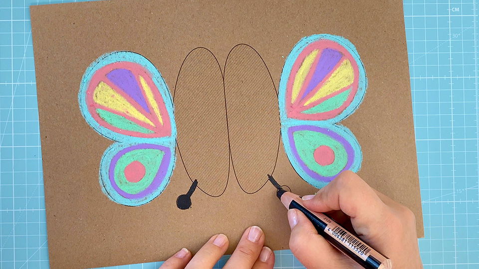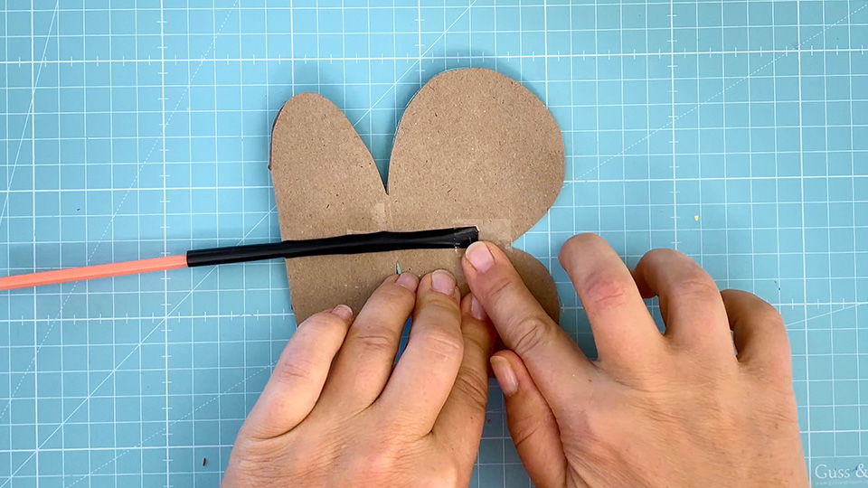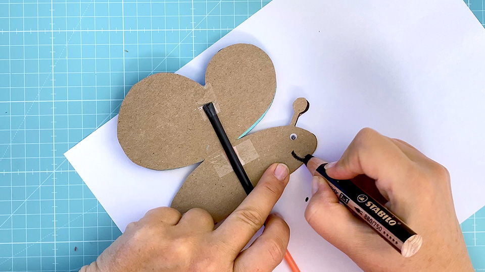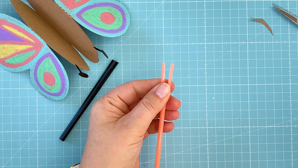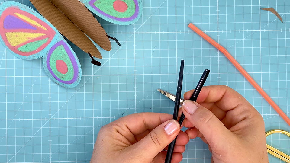 Stülpe den dünnen Strohhalm von unten über den zusammengeklappten Körper des Schmetterlings und fixiere ihn mit einem Klebestreifen direkt unterhalb der Flügel.