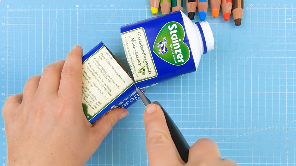 Nimm eine leere Milch- oder Safttüte zur Hand und schneide sie mit einem Cutter-Messer in der gewünschten Höhe ab. Als Richtwert sind es bei mir – vom Boden weggerechnet – ca. 14 cm. Der Schnitt muss übrigens auch nicht exakt gerade sein. Schließlich schneidest Du ja noch einiges von der Verpackung weg.