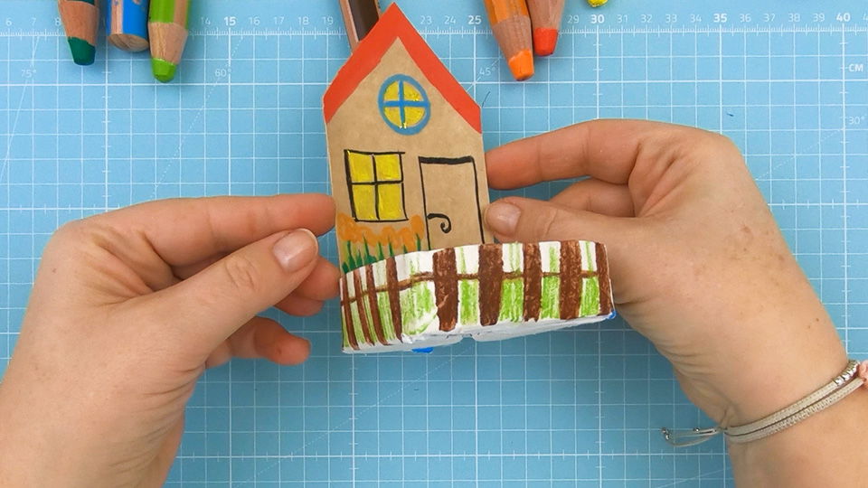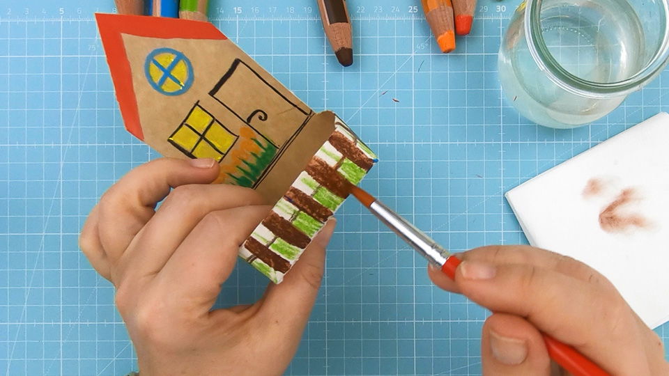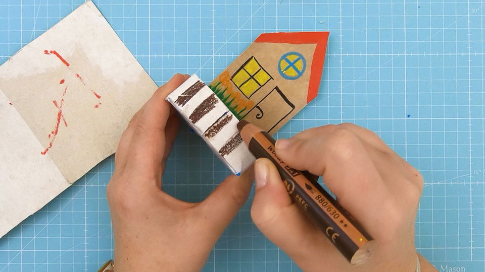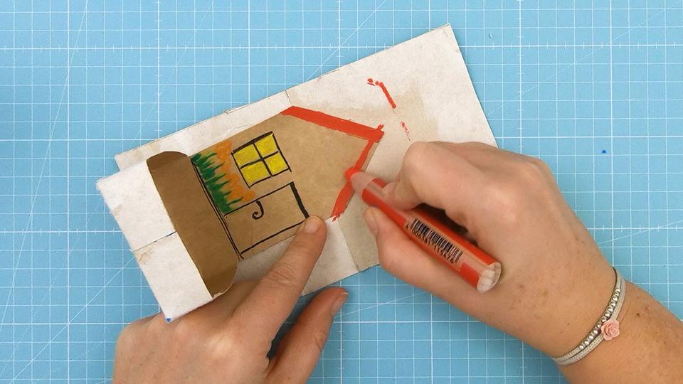 Male das Haus mit den STABILO woody 3 in 1 Stiften nach Belieben an. Verwende am besten auch eine Malunterlage, wenn Du (so wie abgebildet) über den Rand hinausmalen möchtest.