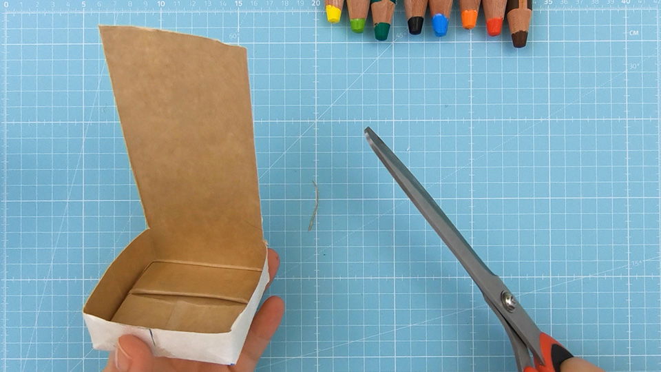 Schneide den Karton von der Öffnung her so ein, dass nur mehr eine Rückwand (= Haus) stehen bleibt. Unten sollte ein Rand von ca. 2 cm stehen bleiben. Hier kannst Du später die Kresse ansäen.