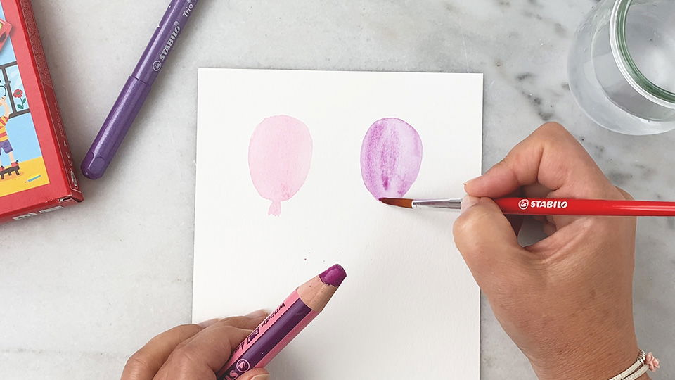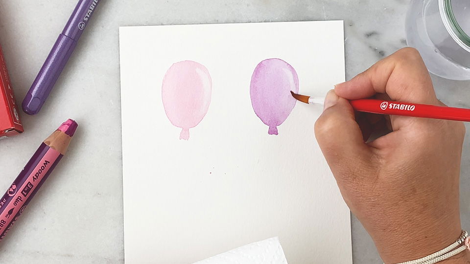 Reinige den Pinsel mit Wasser und trockne ihn mit einer Küchenrolle ab. Streife mit der leicht feuchten Pinselspitze über die bemalte Luftballonfläche und nimm dadurch wieder etwas Farbe vom Papier. So entstehen Lichtreflexe, durch die die Luftballons einen schönen 3D-Effekt bekommen.