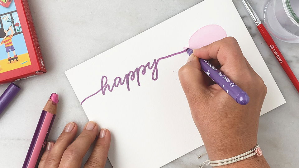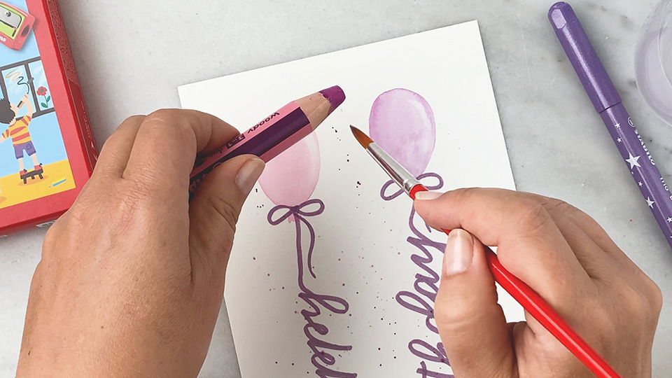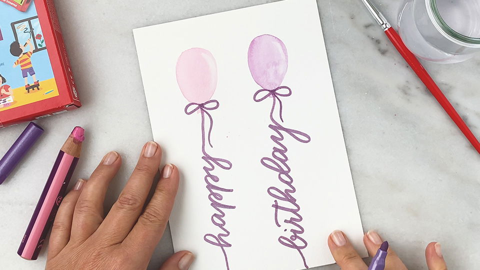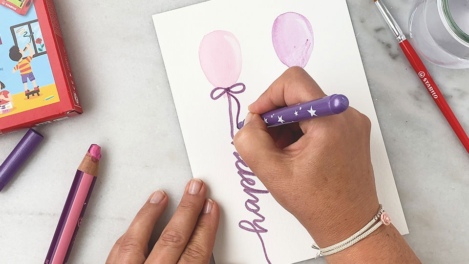 Wiederhole diesen Vorgang mit dem zweiten Wort. Du kannst natürlich auch mehrere Luftballons malen und welche ohne Wörter als Dekoration „dazwischenhängen“ – je nachdem, wie viel Platz Du auf dem Papier / der Karte hast.