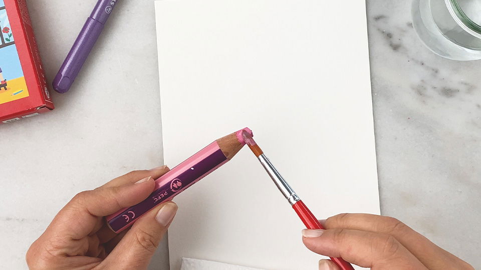 Nimm mit dem Pinsel etwas Wasser auf und streiche mehrmals über die gewünschtes Farbseite der woody duo Mine. Achte darauf, die Farben der Spitze nicht zu vermischen, da es sonst möglicherweise zu einem ungewollten Farbergebnis kommen kann.