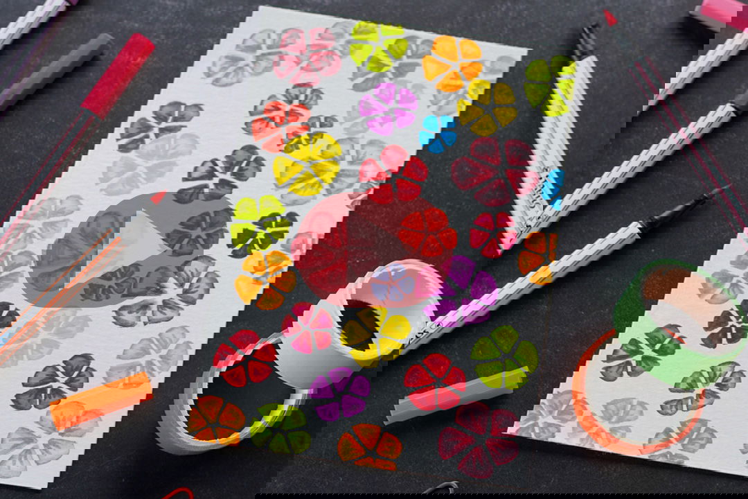 Schritt 4: Wiederhole den Vorgang für jede Farbe deiner Wahl und schon hast du eine kunterbunte Zeichnung mit einfach gemalten Blumen.