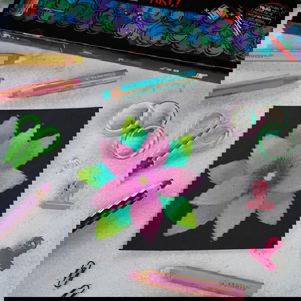 Schritt 5: Erweitere die Blume nun um je ein grünes Blatt zwischen den Blüttenblättern