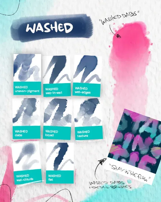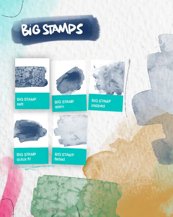 • 5 Big Stamp Brushes: zur Gestaltung einzigartiger Aquarell-Hintergründe. Kombiniere und überlagere die verschiedenen Stempel für wunderschöne Aquarell-Kompositionen