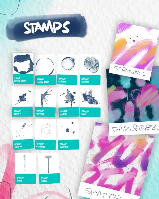 • 13 Stamp Brushes: für kreative Willkür in den Motiven durch automatisch wechselnde Größen und Richtungen. Stemple Farbkleckse und Farbsprenkel einfach individuell in dein Design auf
