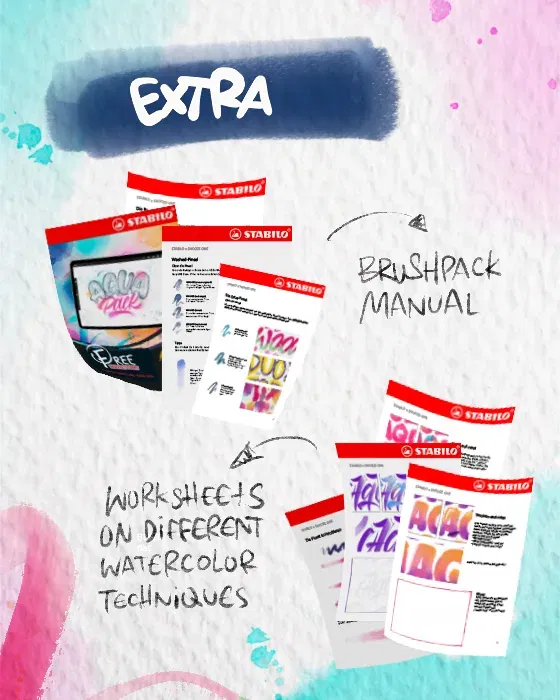 Exklusiv im Set enthalten: Zwei STABILO Stifte als digitale Procreate Brushes! Entdecke die einzigartigen Features des zweifarbigen STABILO woody 3 in 1 duo Procreate Brush und des STABILOaquacolor Procreate Brush!