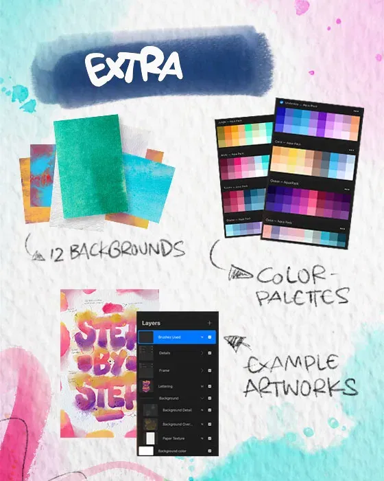 • 11 Hintergründe: die Hintergründe imitieren unter anderem strukturierte Papieroberflächen für realistische Watercolor-Designs