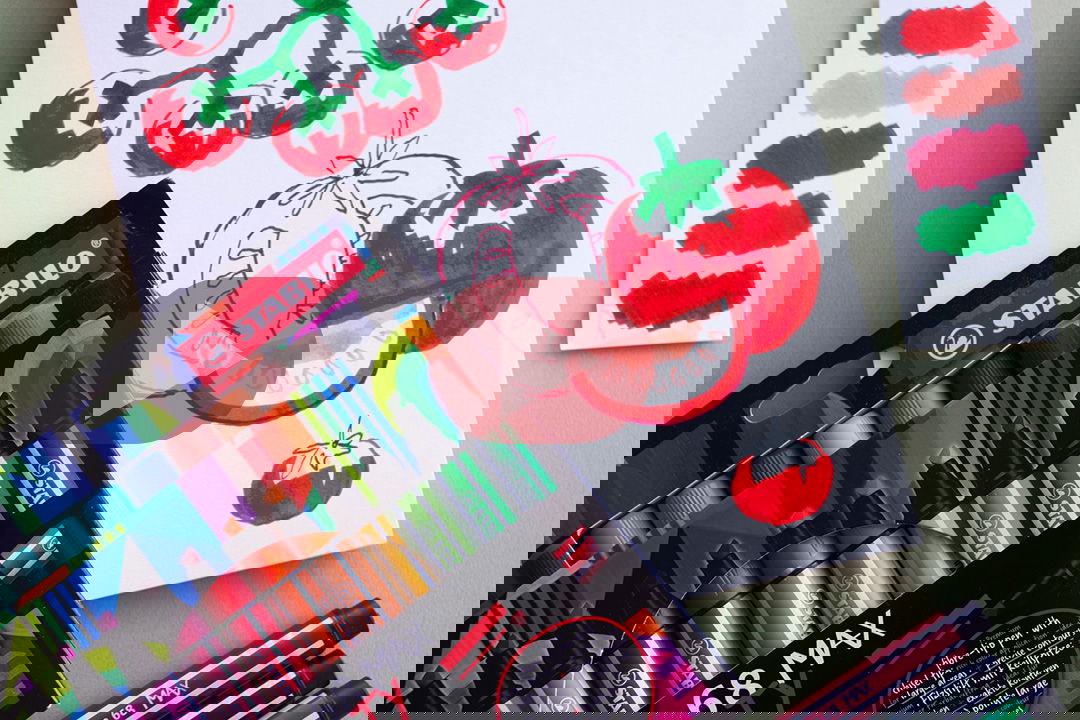 Schritt 1: Nutze verschiedene Farben des STABILO Pen 68 MAX, um eine ganze und geschnittene Tomate zu malen. Dabei kannst du den Stift mit der ganzen Spitze aufsetzen, um Flächen zu malen oder nur mit der Spitze aufsetzen, um dünne Linien zu malen.