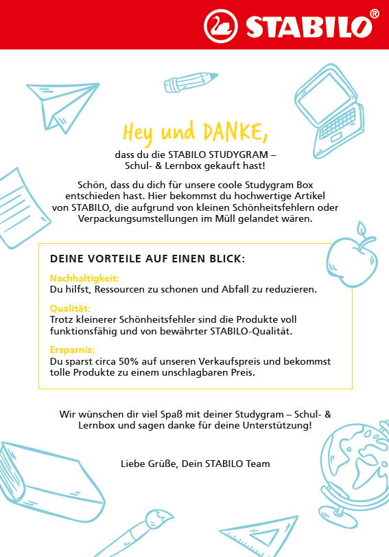 • STABILO Produkte im Wert von etwa 80 € mit circa 50 % Rabatt auf den Standardpreis.