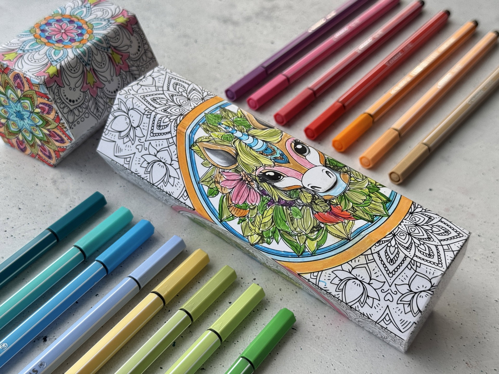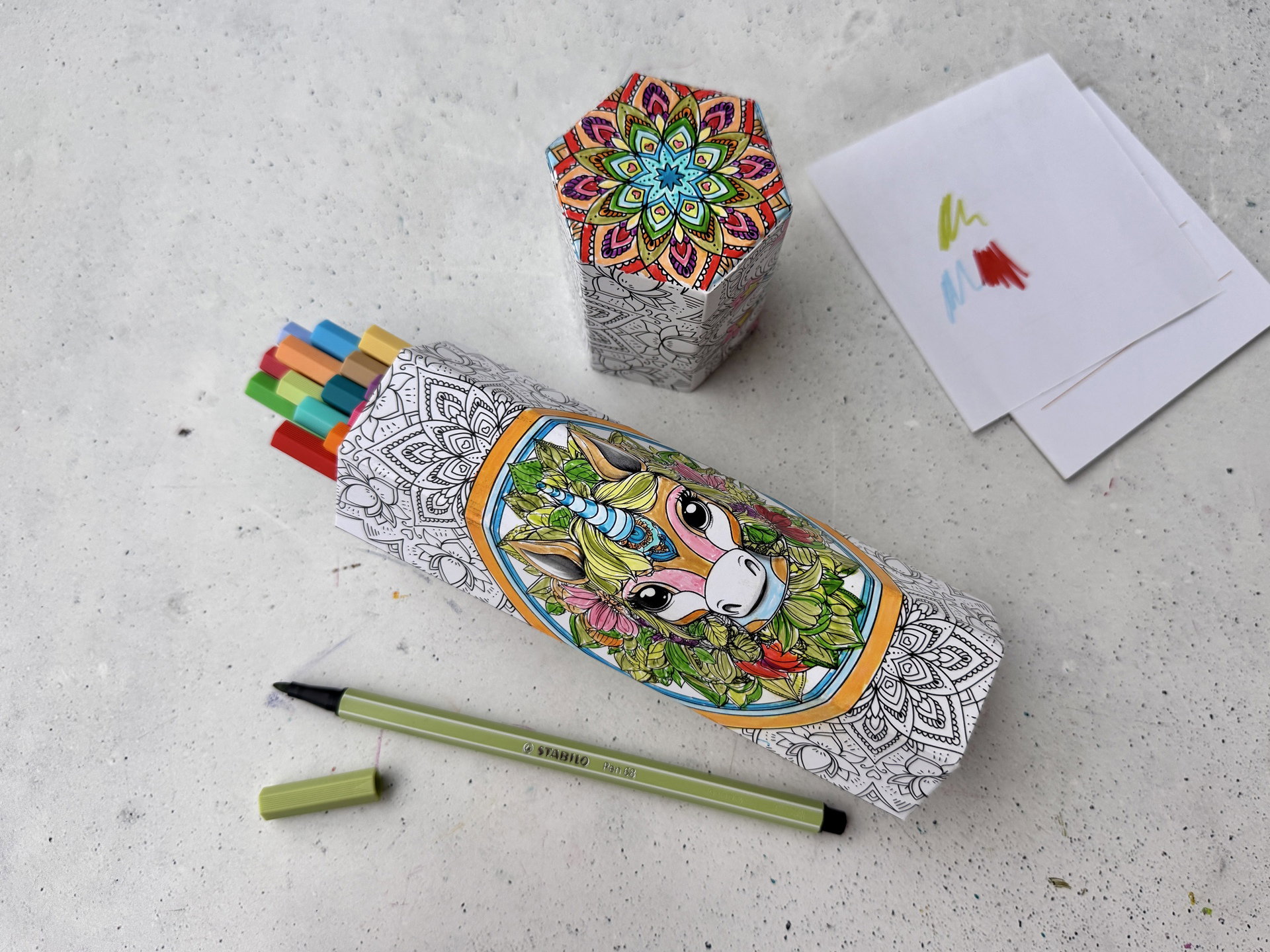 Etui mandala "licorne et dragon " STABILO Pen 68 Etui de rangement carton à colorier de 15 feutres