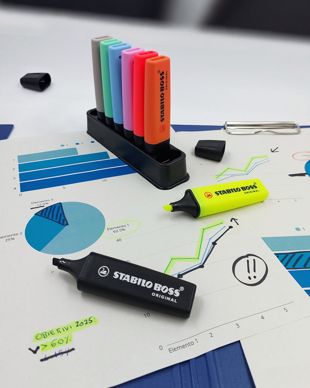 L'evidenziatore STABILO BOSS ORIGINAL in un comodo set da scrivania. Con 8 STABILO BOSS: 1 marcatore nero, 1 colore ispirato alla natura, 2 fluo e 4 Pastel.