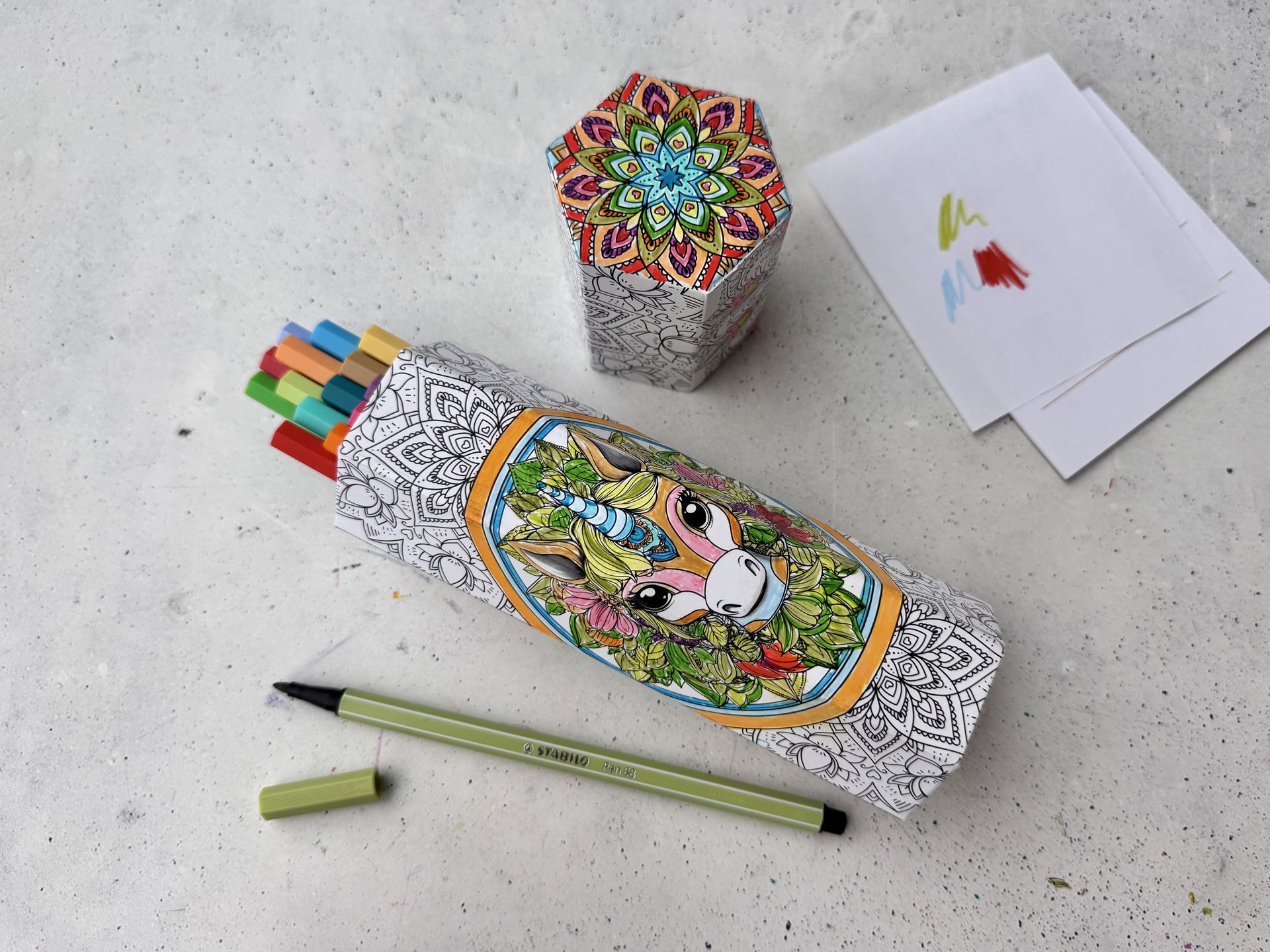 Il pennarello premium STABILO Pen 68 CREATE YOUR OWN da 15 colori per colorare con i design drago e unicorno con i colori: 68/23, 88, 14, 34, 43, 13, 11, 57, 51, 25, 54, 40, 29, 47, 60.
