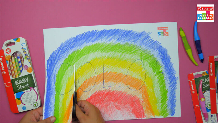 ありったけの色を使って虹を作ってみよう。強く描いたり、やさしく描いたりすると綺麗なグラデーションになるよ。