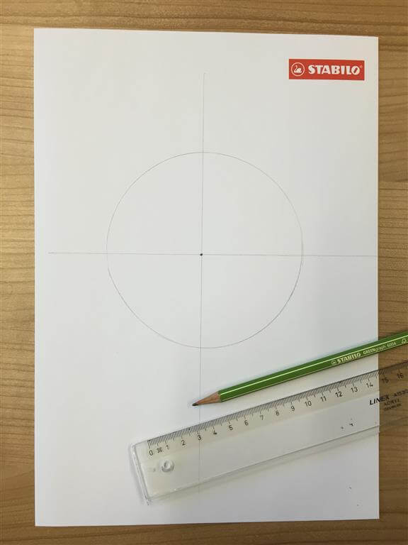 Teken met je liniaal twee lijnen midden door de cirkel zodat er een kruis ontstaat, precies in het midden van de cirkel. Deze is nu in vier gelijke delen verdeeld.