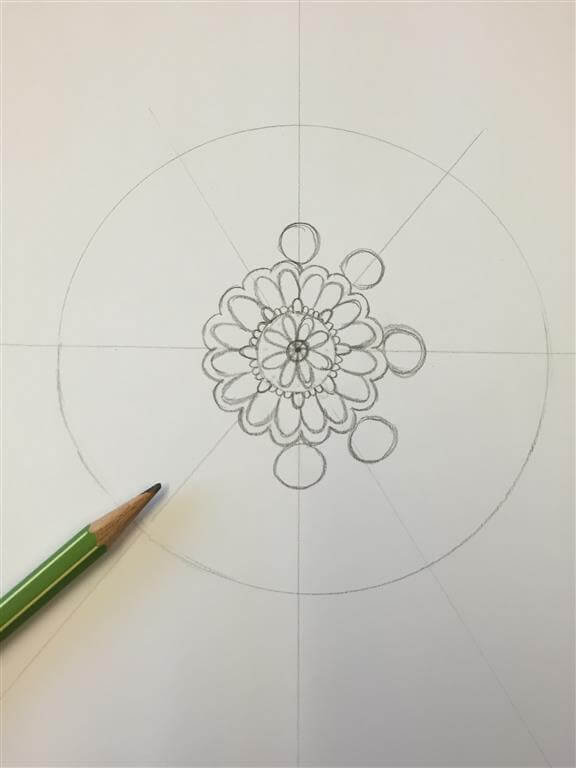 Nu de basis van je mandala staat, kun je beginnen met het tekenen van patronen. Begin hiervoor in het midden, in de kleine cirkel.