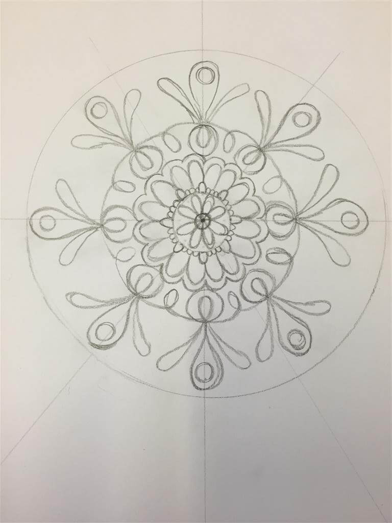 Teken rondom de kleine cirkel motiefjes die jij mooi vindt, bijvoorbeeld de vorm van bloemblaadjes of halve maantjes, nog meer cirkels of vlakken. Herhaal het patroon op een gelijkmatige manier en gebruik hiervoor de rechte lijnen als referentiekaders. Je kunt bijvoorbeeld een bloem tekenen op elke rechte lijn, zodat je er vier om het kleine cirkeltje hebt staan.