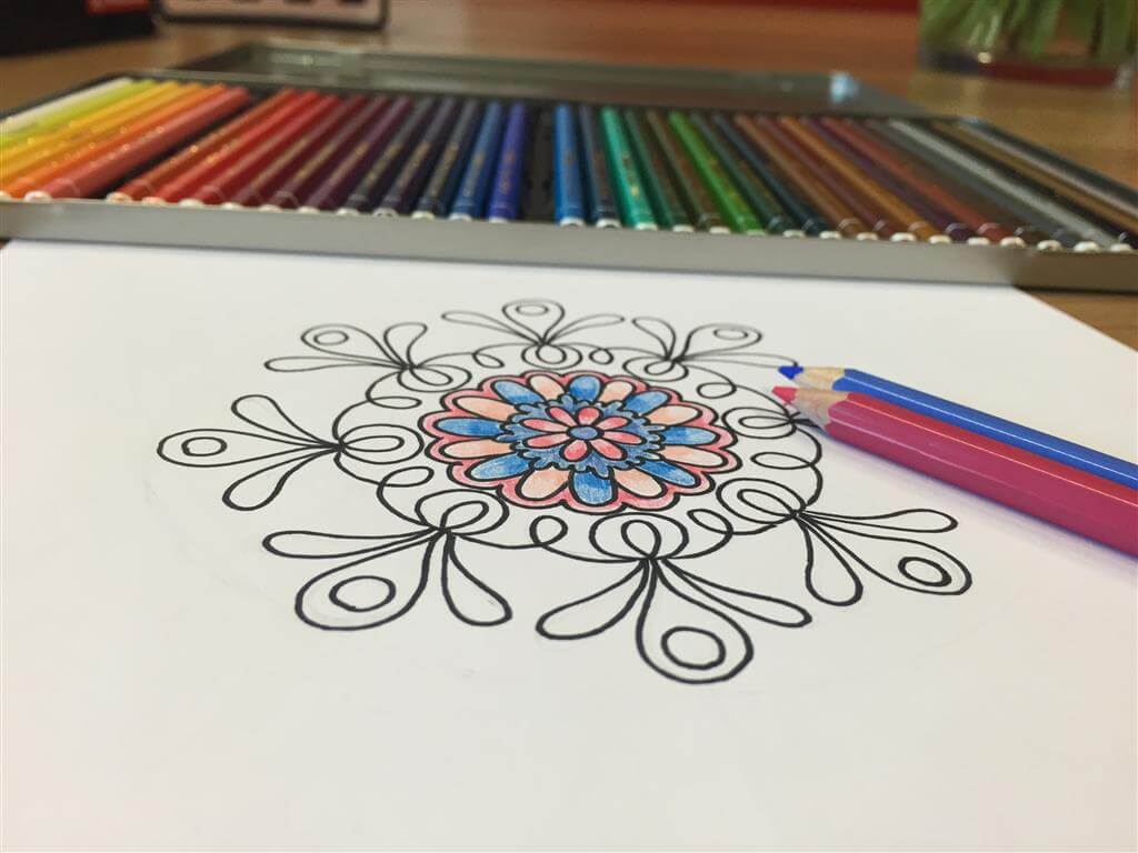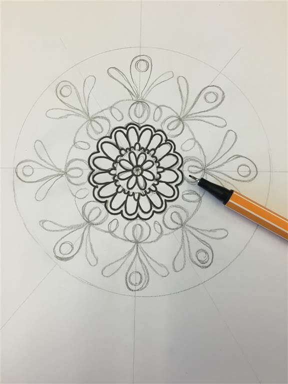 Werk van binnen naar buiten, in een cirkelbeweging, van de middelste cirkel naar de buitenste rand van de mandala. Neem ruim de tijd voor je mandala, het herhalen van het patroon vereist kalmte en aandacht (dat is ook waarom zoveel mensen er rustig van worden).