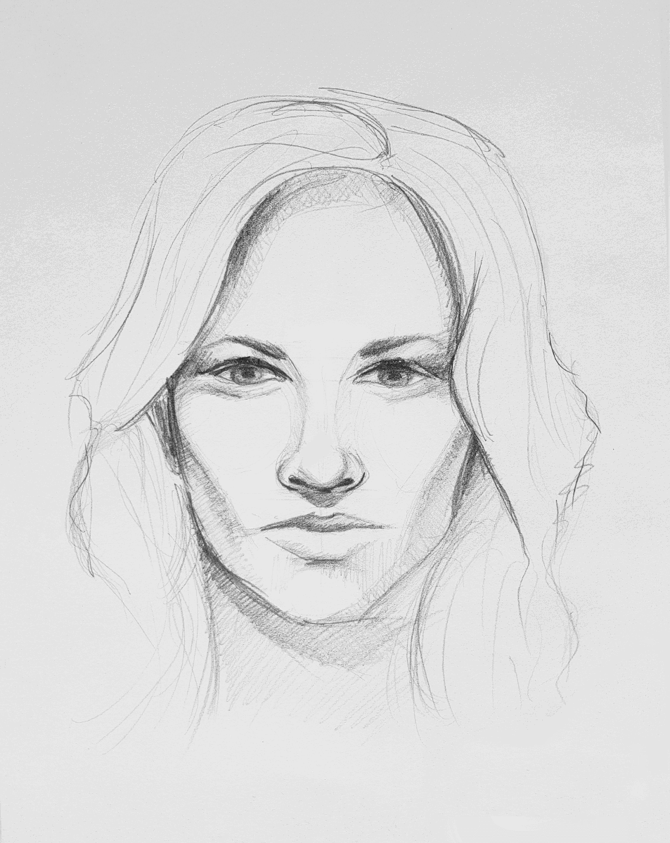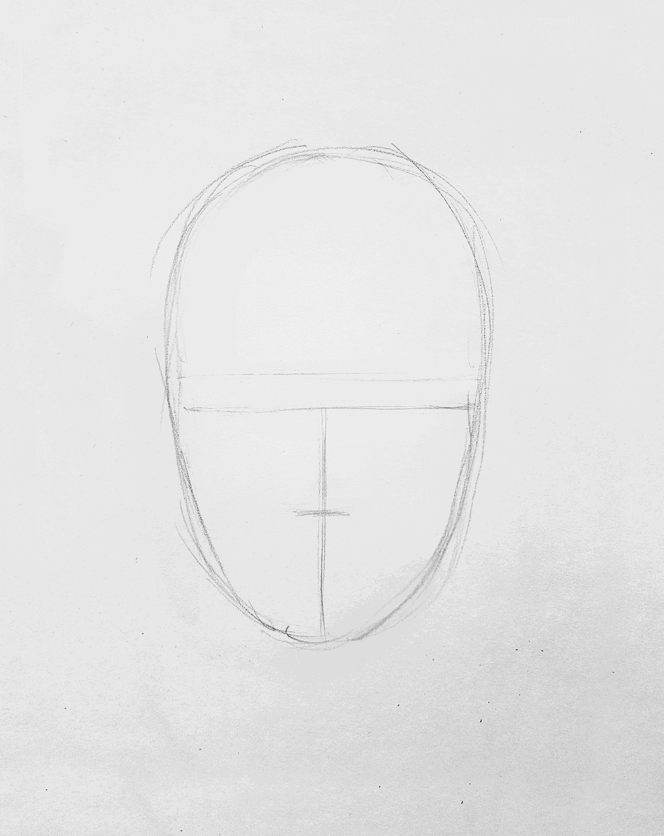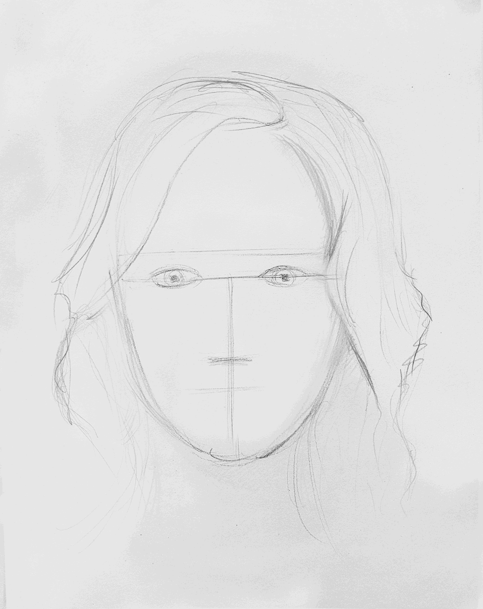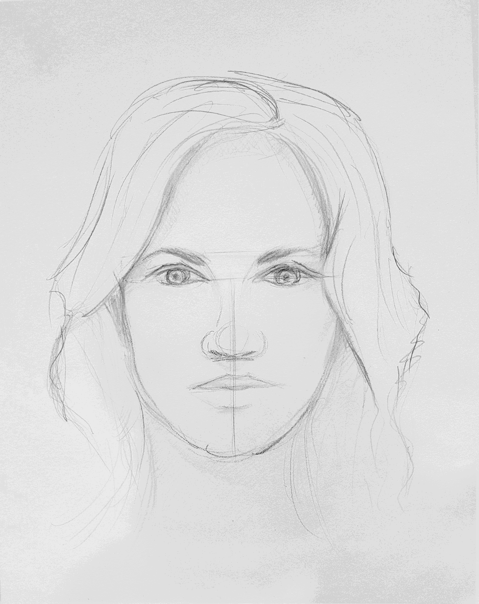 De volgende stap is best lastig, maar als je deze hebt afgerond dan ben je er al bijna! We raden aan om eerst de makkelijkere onderdelen globaal te schetsen, zoals de wenkbrauwen en de rest van de haarlijn. Deze werk je bij de volgende stap verder uit. Schets daarna de vorm van de lippen. Doe dit precies op de lijnen die je eerder getekend hebt. Let erop dat je de mond niet te groot maakt of de lippen te vol, want dan kloppen de verhoudingen van het gezicht niet meer. Schets nu de lijnen van de neus, waarbij de onderkant van de neus leunt op de tweede lijn van onder.