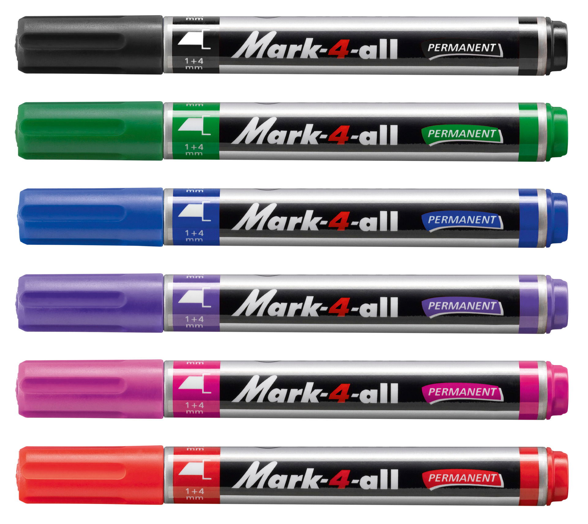 STABILO Mark-4-all. Permanente markers voor iedereen die op gladde oppervlakken schrijft en vakmensen zoals timmerlieden, metselaars of tuiniers die onder extreme omstandigheden en op ongebruikelijke oppervlakken moeten schrijven. Schrijfvaardigheid getest op meer dan 1.000 oppervlakken zoals glas, plastic, foto's, keramiek, folie en metaal. De plastic punt is sterker dan van conventionele markers - hij schrijft duidelijk en goed op harde oppervlakken. Betrouwbaar onder extreme omstandigheden zoals kou, hitte of regen, daarom ook geschikt voor gebruik in vriezers of kassen. Beschadigt het oppervlak niet tijdens het schrijven, daarom ook geschikt voor het labelen van dvd's en foto's. Sneldrogend, watervast, licht- en vorstbestendig. Hoge bescherming tegen uitdrogen zonder dop. De dop kan op het uiteinde van de pen worden bevestigd.