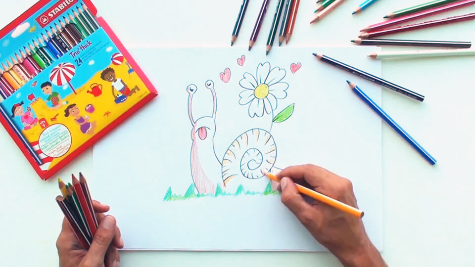 «Улитка Сэмми никогда не беспокоится, хотя он бродит повсюду, потому что у него за спиной его дом, который он несет, и если он устал, он заглядывает внутрь.» :-) Нарисуйте улитку Сэмми, чтобы он мог жить с нами, каждый может научиться этому. Мы использовали утолщенные треугольные деревянные карандаши STABILO Trio, идеальны для маленьких ручек и 24 ярких цветов.