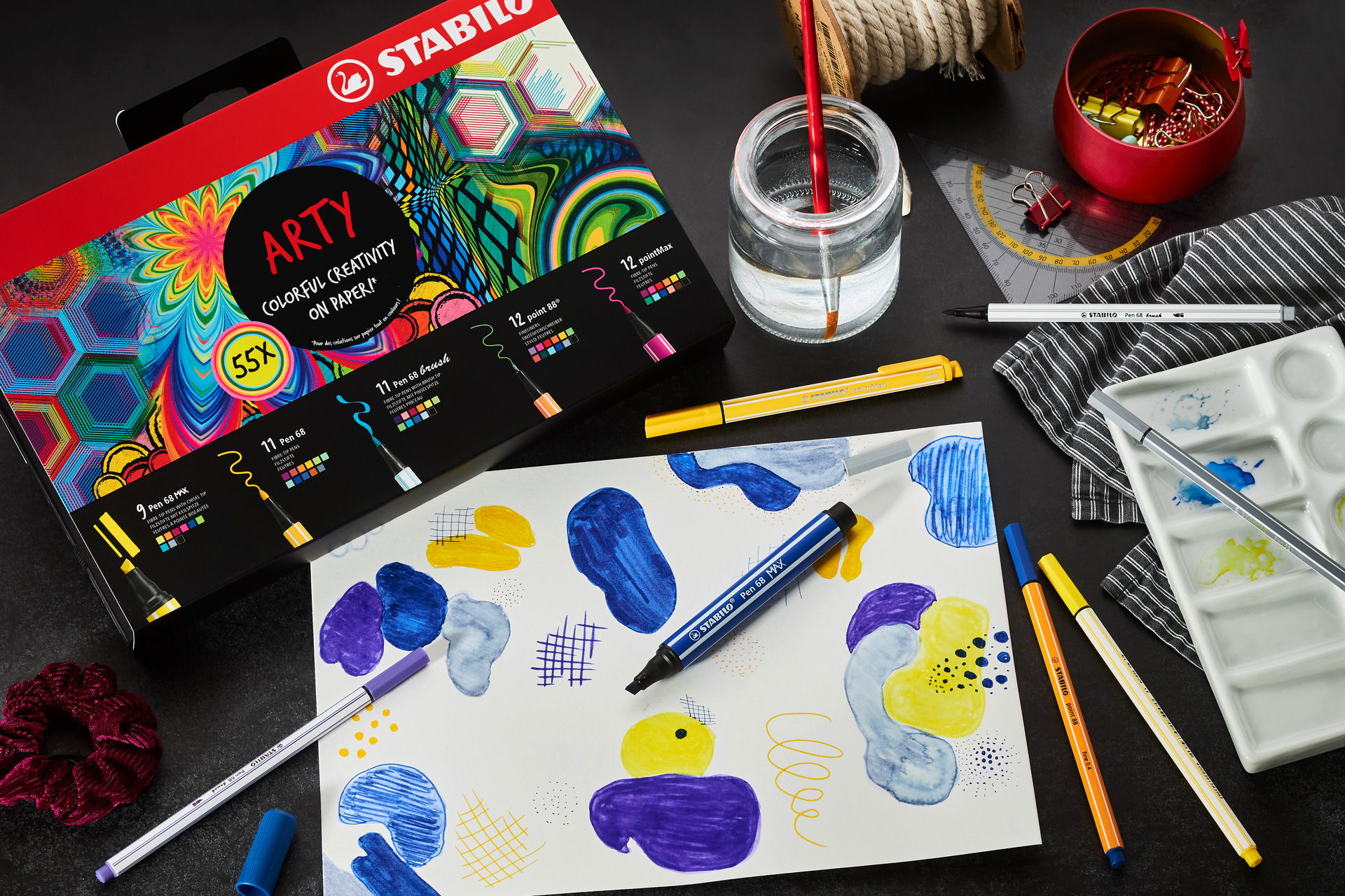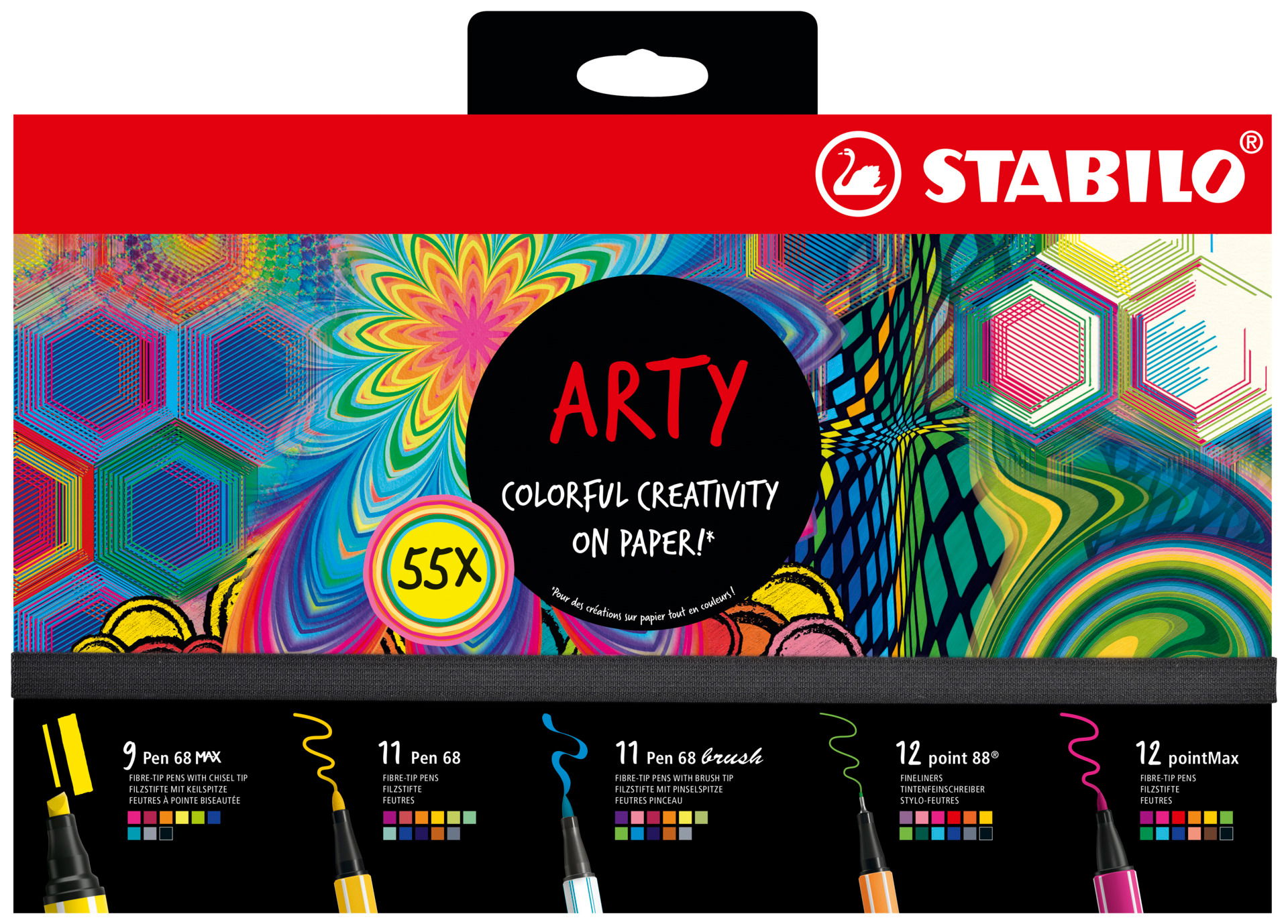 This STABILO ARTY Creative Set contains 55 pens in total: 9 Pen 68 MAX, 11 Pen 68, 11 Pen 68 brush, 12 point 88 and 12 pointMax.