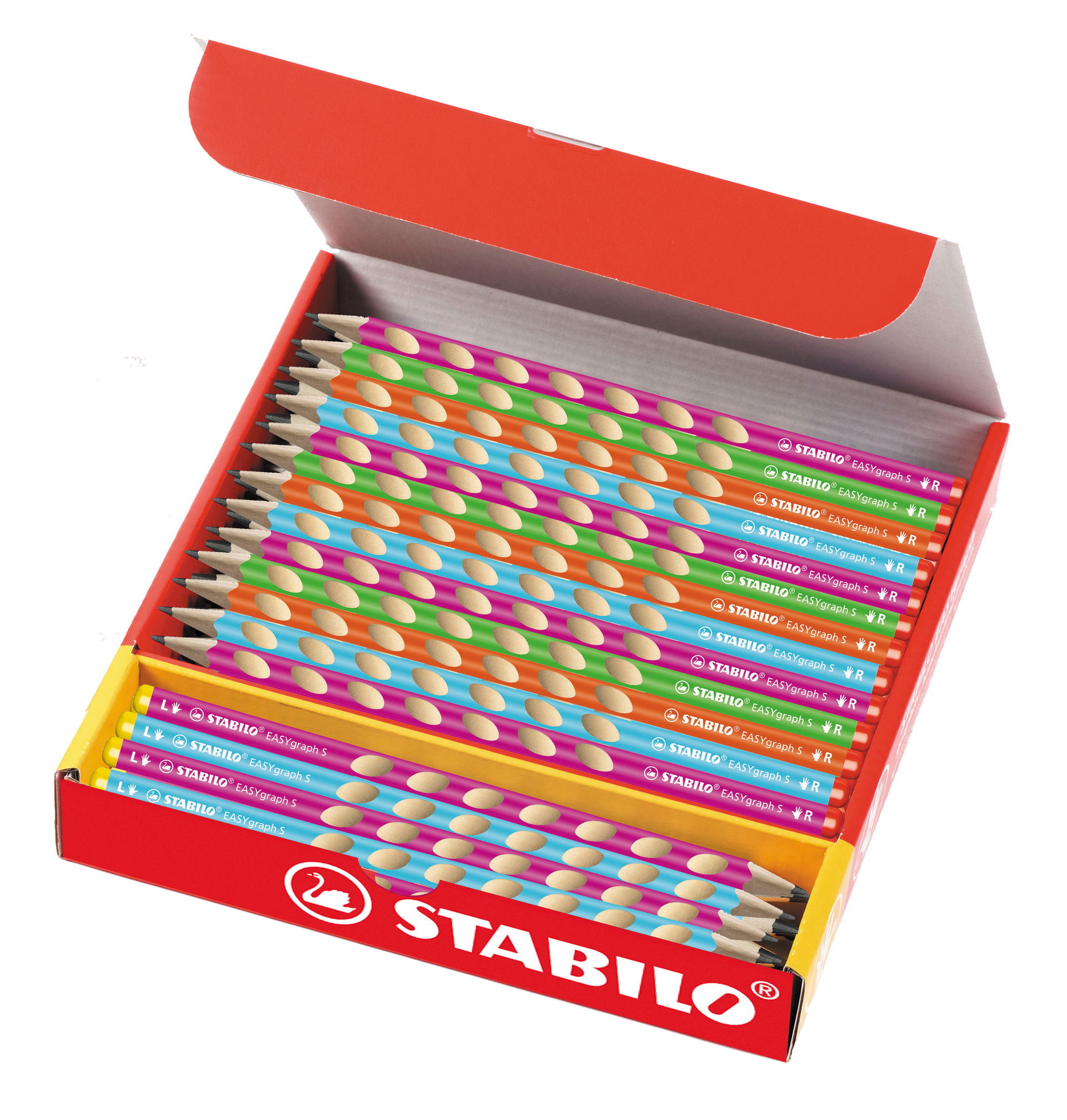 The STABILO EASYgraph S thin ergonomic graphite pencil in a classpack of 48pcs, assorted barrel colours. It contains 8 left-handed pencils and 40 right-handed pencils.